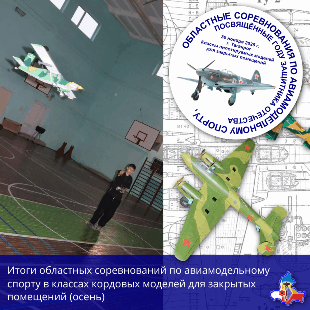 30 ноября 2025 года в г. Таганроге на базе спорткомплекса МБОУ СОШ №38 проводились областные соревнования по авиамодельному спорту в классах кордовых моделей для закрытых помещений (осень), посвящённые Году защитника Отечества. В соревнованиях приняло участие 5 команд из 5 муниципальных образований Ростовской области: Ростов-на-Дону (ОЦТТУ), Таганрог (ЦТТ), Батайск (ЦДТТ), Шахты (СЮТ), Волгодонск (СЮТ).