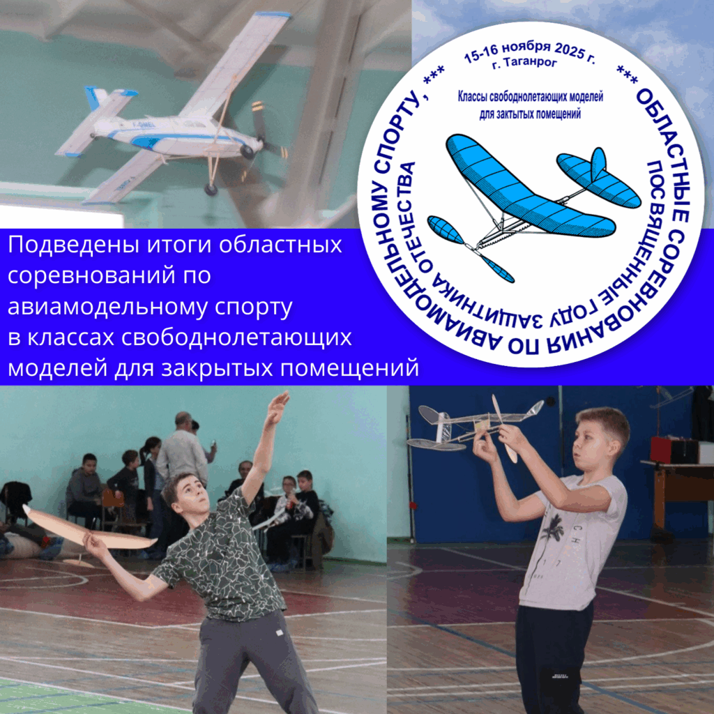 15-16 ноября 2025 года в г. Таганроге на базе спорткомплекса МБОУ СОШ №38 проводились областные соревнования по авиамодельному спорту в классах свободнолетающих моделей для закрытых помещений (осень), посвящённые Году защитника Отечества. В соревнованиях приняло участие 9 команд из 7 муниципальных образований Ростовской области: Ростов-на-Дону (ОЦТТУ, ЦДТТ), Таганрог (ЦТТ, СОШ №38), Неклиновский район (СЮТ), Батайск (ЦДТТ), Шахты (СЮТ), Азов (СЮТ), Новочеркасск (СОШ №11).