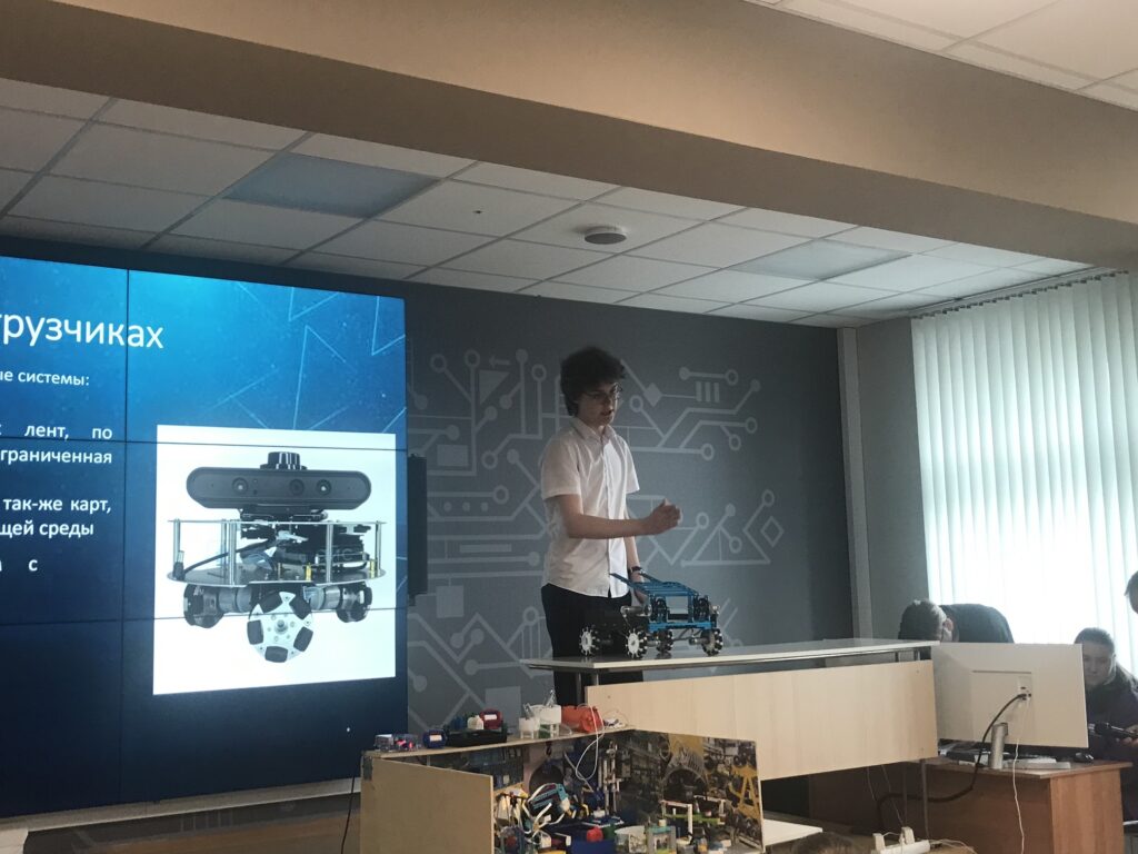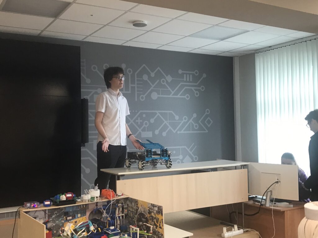 — Аксенов Егор обучающийся ГБУ ДО РО ОЦТТУ в номинации «Промышленные технологии и робототехника» продемонстрировал проект «Робот-погрузчик».